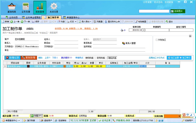對于農先生他們公司需要的開單方式,在飛揚動力廣告公司管理軟件中是很輕松就能完成的,例如他們的客戶把需要制作的圖片發給他們后,要采用1.2MM厚板進行加工,材料單價是60元/平米,客戶要做1張,寬3M高1M的厚板,后期加工這張板要20個沖孔,一個沖孔的單價是5元/個,那么在軟件中開單就應該如下圖所示,前面的材料計價就是寬*高*數量*單價=180元,而后期加工是按照加工金額來算,就是直接算所有的沖孔的總價格是20*5=100元,總價格就是180+100=280元。