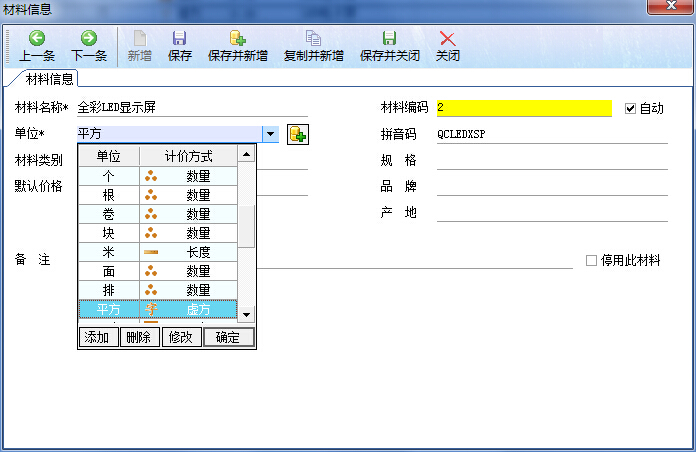 而在我們的廣告公司財務軟件中,材料的計價方式主要有4種:按面積計價、按長度計價、按數量計價、按周長計價,以及現在的LED行業按照虛方計價的。如下圖所示: