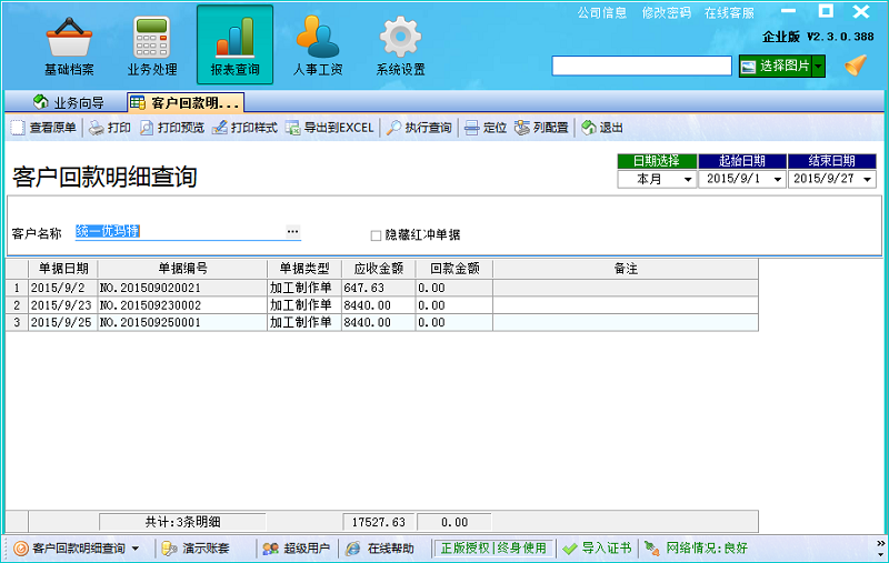 在廣告公司管理系統中,與客戶對賬可以分為按明細對賬和按單據對賬。按照明細對賬,就在業務處理中,打開往來對賬,選擇客戶與日期,軟件會自動把客戶在改日期內的嗦有單據都顯示出來,并且包括單據的總應收金額與單據的具體明細