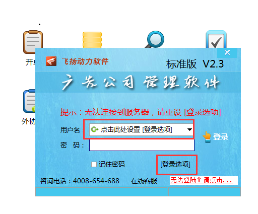 然后再回到客戶端登陸界面,如果軟件提示:無法連接到服務器,請重設[登錄設置],那么久如下圖所示,點擊紅色框的“點擊此處設置[登錄設置]”或直接點擊“[登錄設置]”