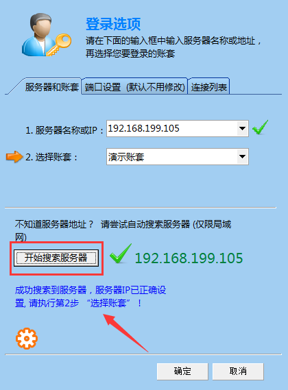 當進入登錄選項設置界面后,如下圖所示,點擊“開始搜索服務器”[注:此操作只針對服務器在同一局域網中],如果搜索到服務器,軟件會提示:成功搜索到服務器,服務器IP已正確設置,請執行第2步“選擇賬套”,選擇好賬套后,點擊確定。