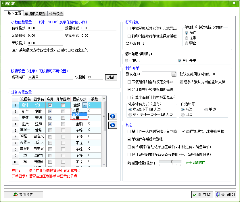 在廣告公司管理軟件中系統(tǒng)設(shè)置--系統(tǒng)配置中。每個(gè)流程節(jié)點(diǎn)都可以按照總量,或是按照金額來(lái)進(jìn)行提成。