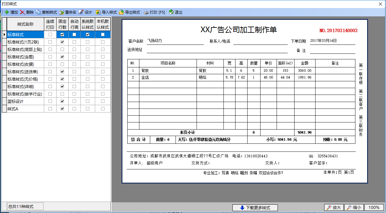 1.可以在加工制作單中直接進行打印,送貨,對賬收款。(注:打印樣式可以選擇不同的樣式進行打印)